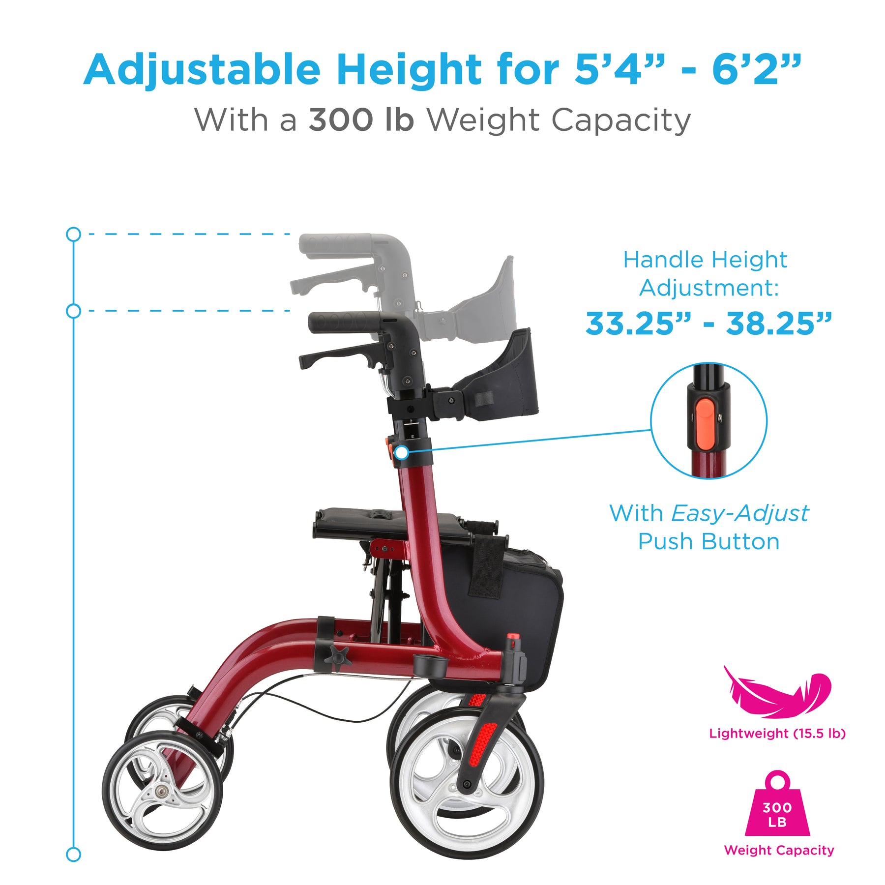 - GREAT ALL-TERRAIN ROLLATOR with 10” and 8” WHEELS takes you on an adventure ride and makes the EXPRESS Rollator great for outdoor and indoor use. The front wheels are 10” and the rear wheels are 8”. The strong, super stable and sleek frame is so attractive and has a lifetime limited warranty. The Express weighs only 15 lb., has a 300 lb. weight capacity and an approximate user height of 5'4" - 6'2".